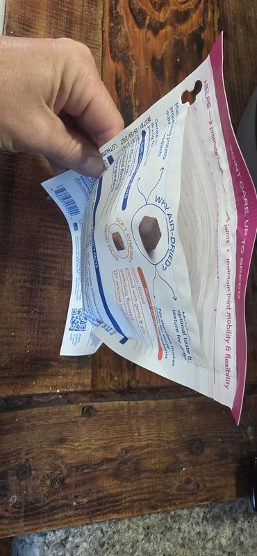 Easy to open bag. My dogs love the taste. My dogs are currently on another supplement containing glucosamine and chondroitin among other ingredients. I wasn't seeing much change in my 12-year-old dog that is known to have arthritis. Adding this product which also contains collagen and hyaluronic acid I have seen an improvement in his mobility over the past couple of weeks, although I feel like I won't have a true result until the first bag has been given completely