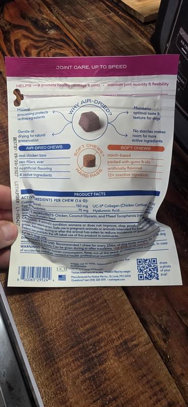 Usually, love Native Pet products, but this one did not agree with my dog at all and was causing my dog to throw up after eating. He does have a sensitive stomach to some new treats and supplements, and we gave this a try for 4 days to see if it would benefit him. He was good the first 2 days on it, but on the 3rd day and now the 4th day, he's thrown up his breakfast, and this is the only thing new added to his diet. He's turning 5 this year, so I wanted to add more supplements to his diet. Moreover, the chews arrived completely flatten and crushed from transit, and the bag's resealed tab, completely broke upon opening and I had to use a clip to seal the bag. Not sure if I got a bad bag or not.