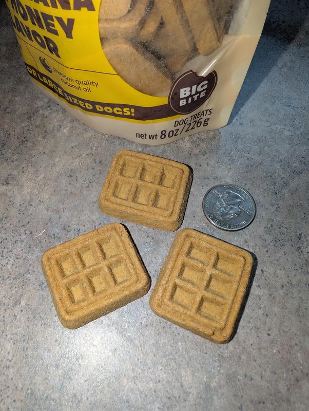 These are a very sturdy, crunchy biscuit. Smell good and the boys are always happy for cookies! They look like mini waffles, but the "big bite" is much bigger than a quarter. I'm sure they're great for big dogs, but I find for my medium size dogs it takes them a few minutes to eat and enjoy them, which is great since they have a tendency to inhale most treats.