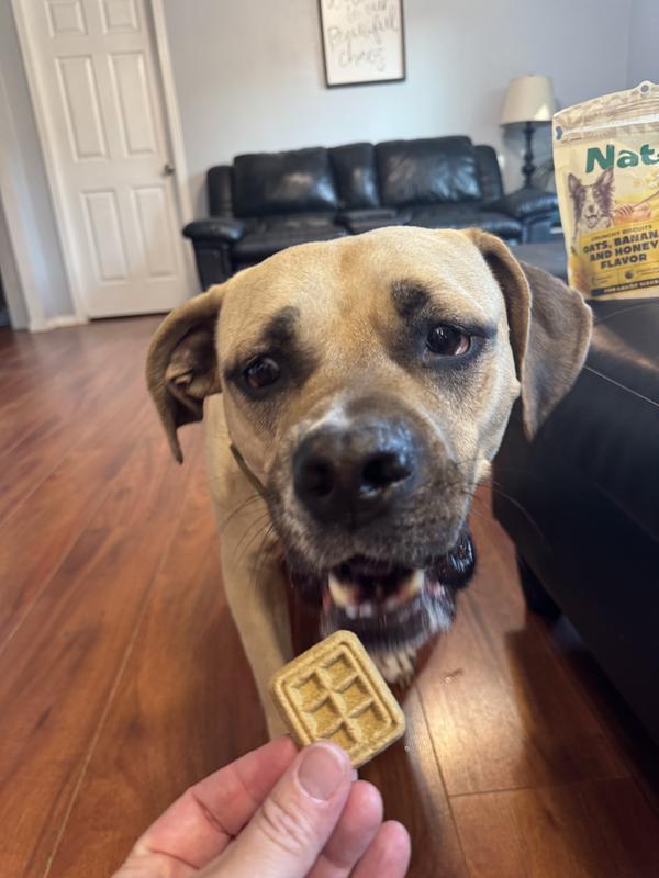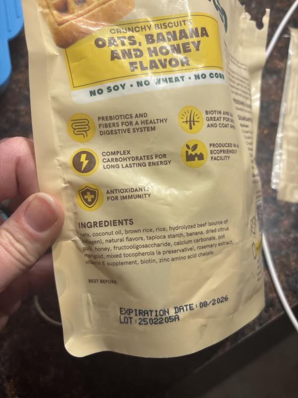 I received this product and initially I didn’t know if my dog would like it because he doesn’t eat banana 🍌 as a single ingredient but he is super excited to eat this as a special treat! I give them to him when he’s been a good boy and listens to what I’ve instructed him to do. (Stop barking, leave the cats alone, stay out of the kitchen etc) I like that there’s oatmeal in it because he has sensitive skin and tummy and I think he likes its crunchy cookie/ waffle texture. I’m not worried about giving him too many of them because they’re not too high in calories and they seem wholesome enough. We will be trying other flavors!