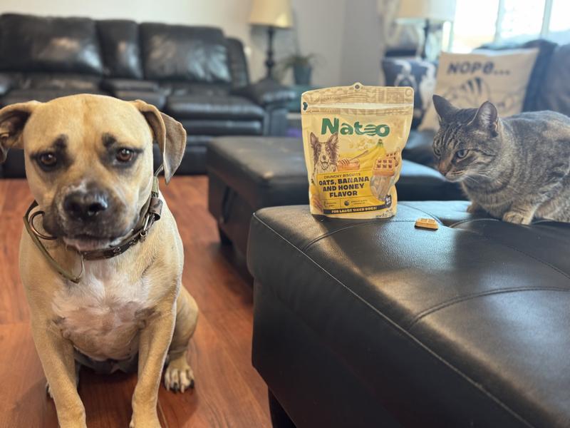 My dog absolutely loves the Natoo Oats, Banana & Honey Big Bite Crunchy Biscuit Dog Treats. The size is perfect for a larger breed (mine is a 10-year-old Labrador),