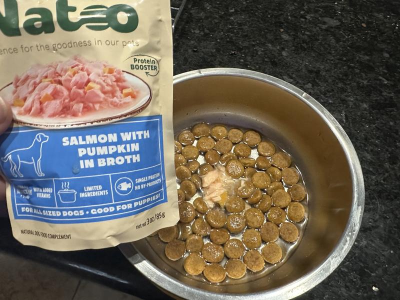 My dogs loved these. I’m sure their feeding routine gets boring sometimes, and this adds the right amount of yummy goodness to their kibble. The pouches contain mostly broth with some chunks of salmon and a few bits of pumpkin. The solid to liquid ratio would be disappointing if it was not a meal topper. The quality of the ingredients seems to be good. The limited ingredient formula is perfect for my dog that has a chicken allergy. While this product contains salmon, it does not have an overwhelming fishy odor. I’d describe the smell as a mild tuna scent. It mixes easily with kibble. The box the pouches come in was easy to open and makes storage of all the pouches simple and readily available. It fits nicely on a shelf. I would get this again.