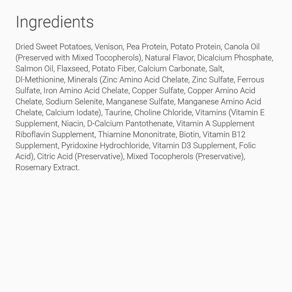 • Venison provides essential protein and amino acids to help maintain strong muscles, while sweet potatoes offer a grain-free source of fiber to support healthy digestion.