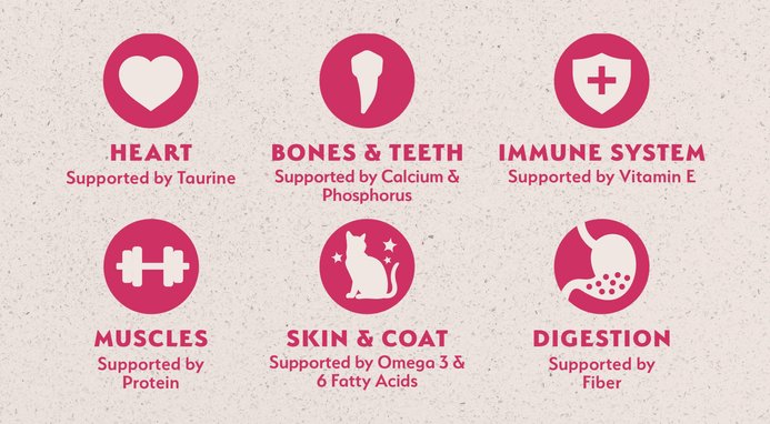 The Natural Balance Balanced Nutrition Commitment ensures that all their kibble products help support your cat’s whole-body health in six key areas: Heart (supported by taurine), Bones & Teeth (supported by calcium & phosphorus), Immune System (supported by vitamin E), Muscles (supported by protein), Skin & Coat (supported by omega 3 & 6 fatty acids), and Digestion (supported by fiber).