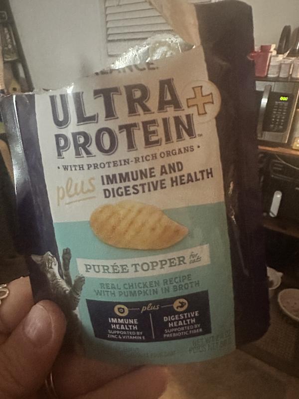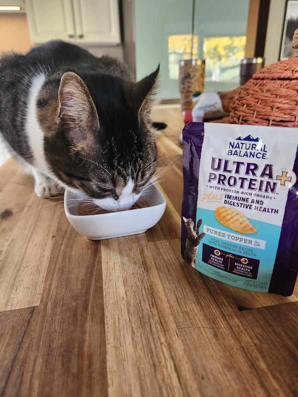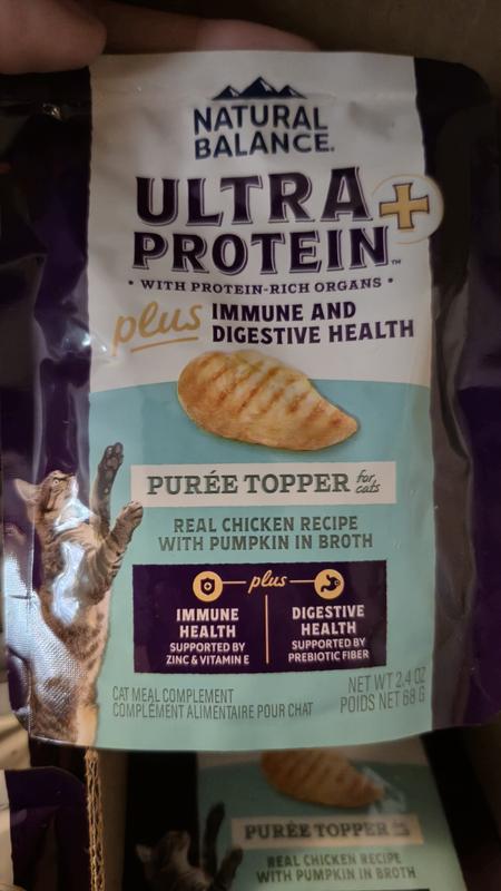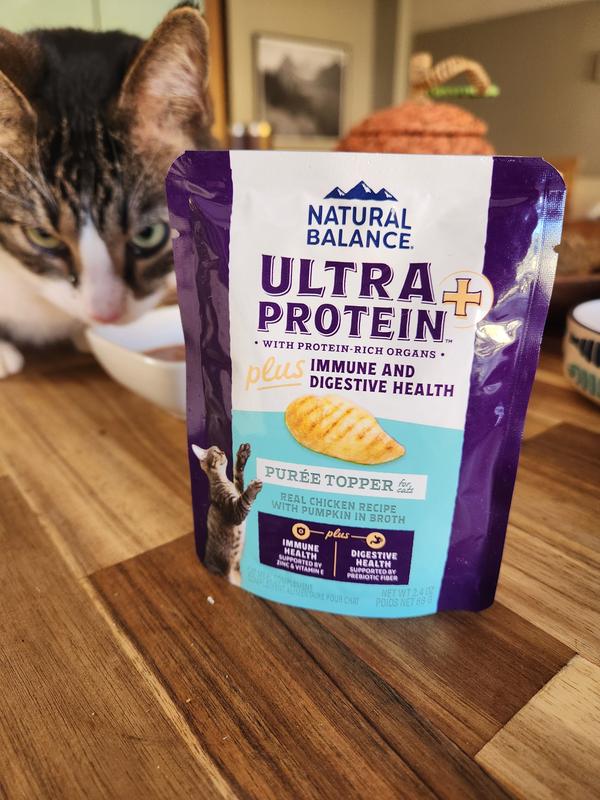 Natural Balance Ultra Protein Plus Immune & Digestive Health Real Chicken with Pumpkin Recipe Puree is a tasty grain-free, preservative--free, artificial colors/flavors-free wet cat food that my cat gives two paws up! It has real ingredients like chicken, chicken heart and chicken liver to satisfy your cat. I really like that it has vitamin E, zinc and selenium to support my cat's immune system as well as fiber rich pumpkin and prebiotics to support my cat's digestive system. I highly recommend this Natural Balance wet cat food.