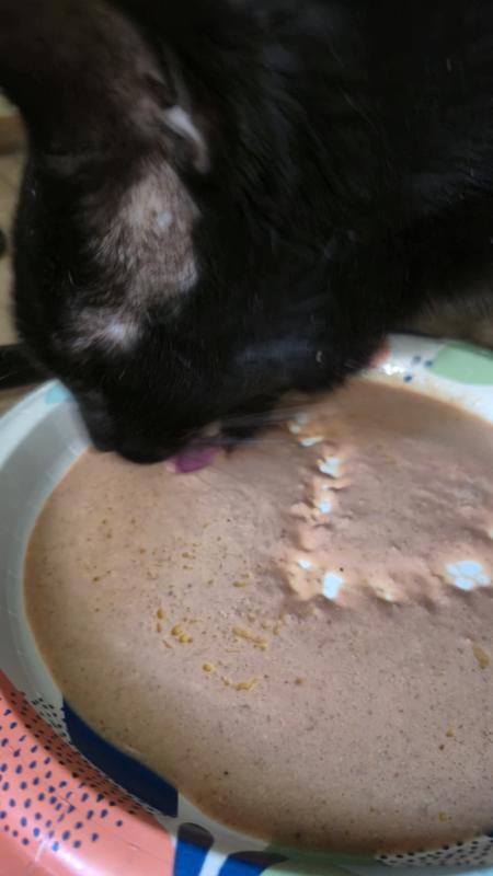 Franky, Sammy, and Bacon loved this product, however their humans were less enthusiastic. This is a very loose and runny product and both our long-haired cats needed a wipe down after sampling. Be sure to have pet wipes and floor products nearby for this one!