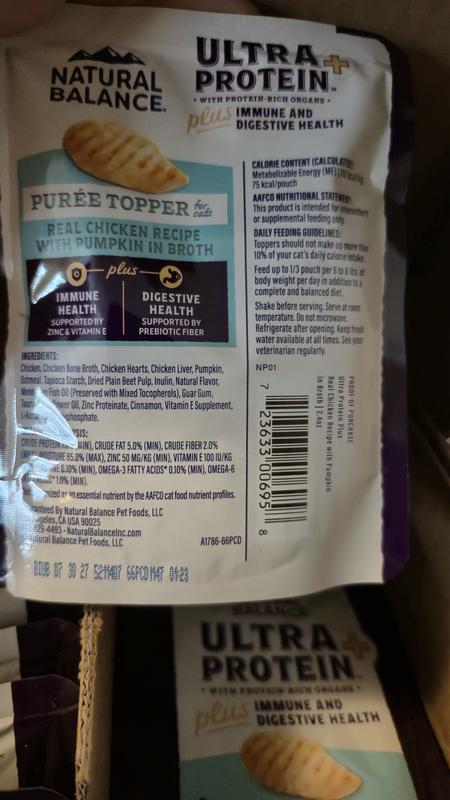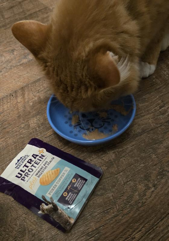 My cats love Natural Balance puree topper! They eat it faster than I can get a photo! We have three cats and split one pouch between them for their evening meal time. I like that the ingredient label looks pretty good With chicken, chicken organs, and pumpkin for digestive and immune health. The cats think they are getting a special treat! It comes in a pouch and they are trying to lick it before I can get it poured into each bowl. It's a nice soft puree, no pieces.