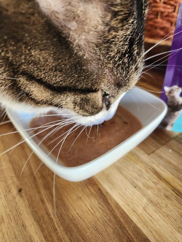 I offered this to my cat one afternoon along the side of some treats. She ate about half of and left the rest in the bowl. It had an odd consistency. Parts of it was watery and running while other parts of it was rather thick and pasty. Maybe I needed to shake it up or kneed the bag more before I gave it to her. It didn't smell bad as a lot of other liquid cat treats and/or food do. My cat is super picky and I’m thinking about only giving her part of it at a time. She probably wouldn't eat it at all if I put it on top of her dry food.