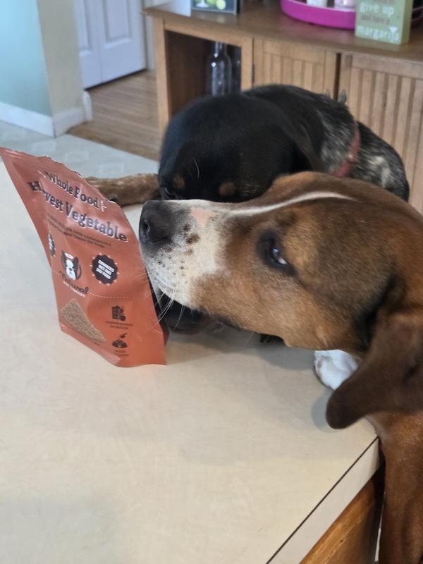 My girls were very excited to try their new supplement. I will say that they absolutely love to eat and have really been enjoying the addition to their meals. It is easy to use and comes with a scoop in the bag. I like giving them a little something extra on their dry food to make it more appetizing. I noticed that they had some gas when we first started it but that seems to have gotten better. I was disappointed to see cane sugar in the ingredients because I am sure the pups would not miss that but overall, they are happy with their "harvest veggies!"