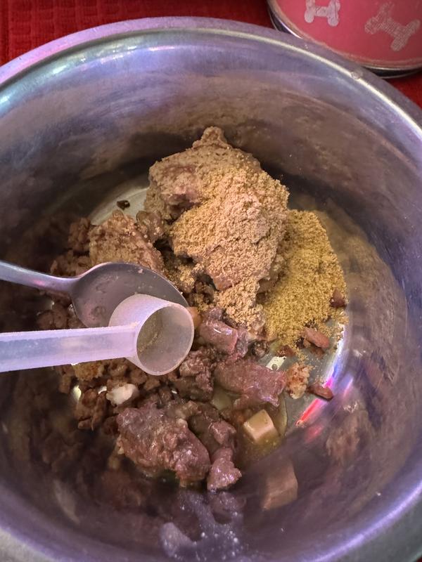 I use this product every morning on my dogs food. My dogs can be a picky eaters and they really enjoy this supplement as a meal topper. This supplement has been very easy on my dogs stomachs even with my dog who has IBD. This supplement comes as a powder and I just add water and a little goat milk to it to go over their kibble. I like knowing they are getting all the nutrients they need in every meal.