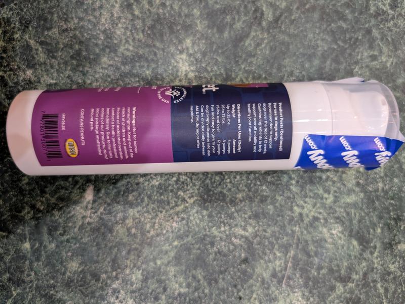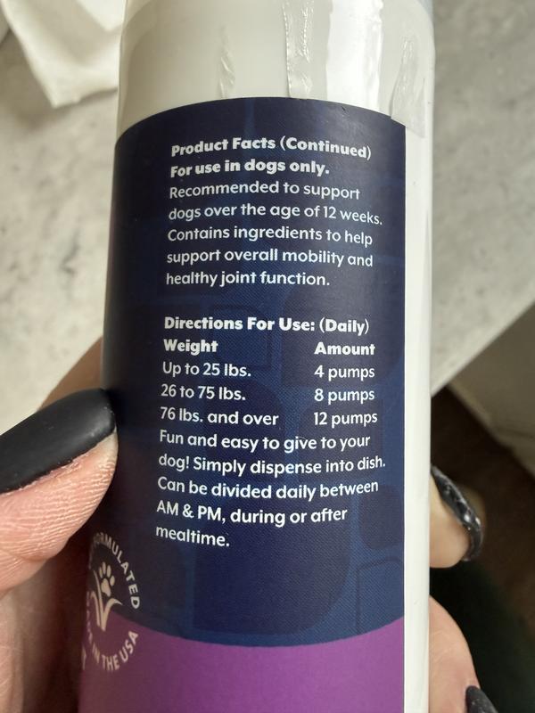 This joint and mobility formulation is tasty for our dog. We don't have to worry about a pill that she may not eat. It is formulated with glucosamine and MSM which are great to support joints. Since we have a large dog, it requires 12 pumps daily.