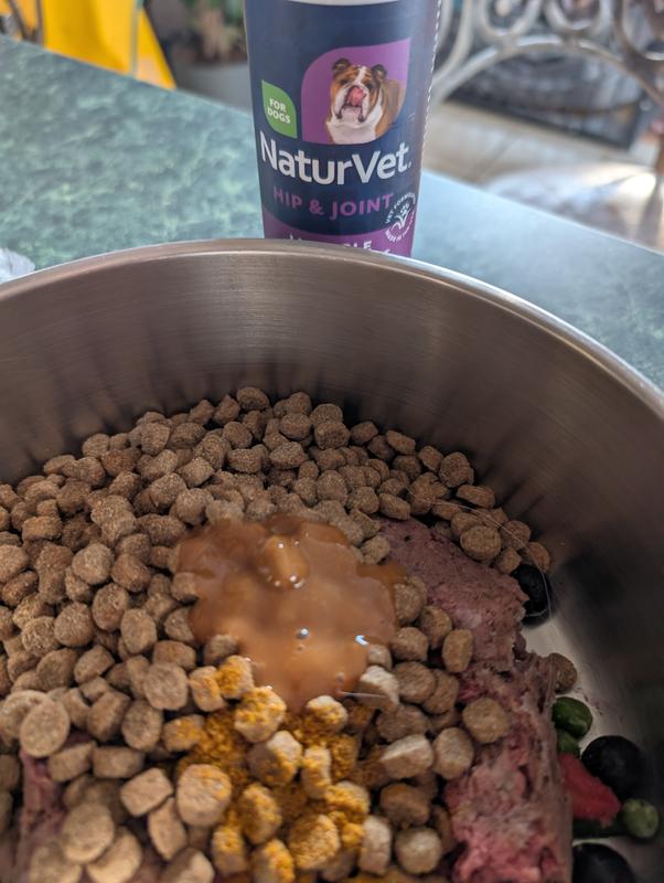 My 14 yr old pit bull loves the taste of the peanut butter on her food. It’s like a Treat on top. I’ve seen some improvement when going for a walk and in the evening getting up after resting.