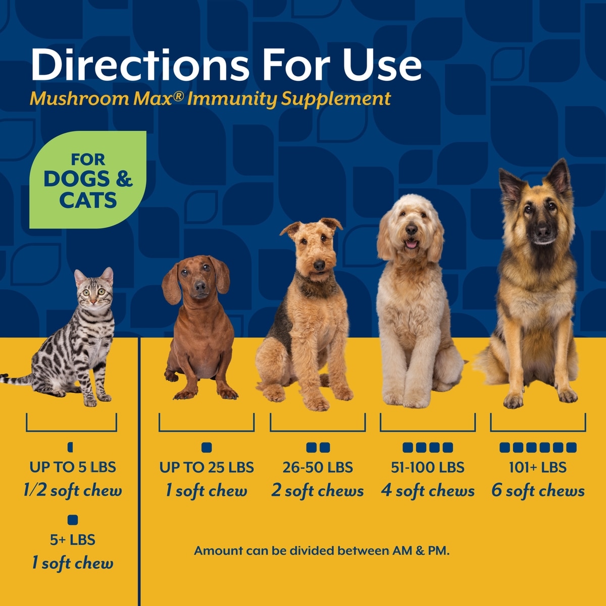 For cats up to 5 pounds feed 1/2 soft chew daily. For cats over 5 pounds and dogs up to 25 pounds, feed 1 soft chew daily. For dogs 26-50 pounds, feed 2 soft chews daily. For dogs 51-100 pounds, feed 4 soft chews daily. For dogs over 100 pounds, feed 6 soft chews daily.