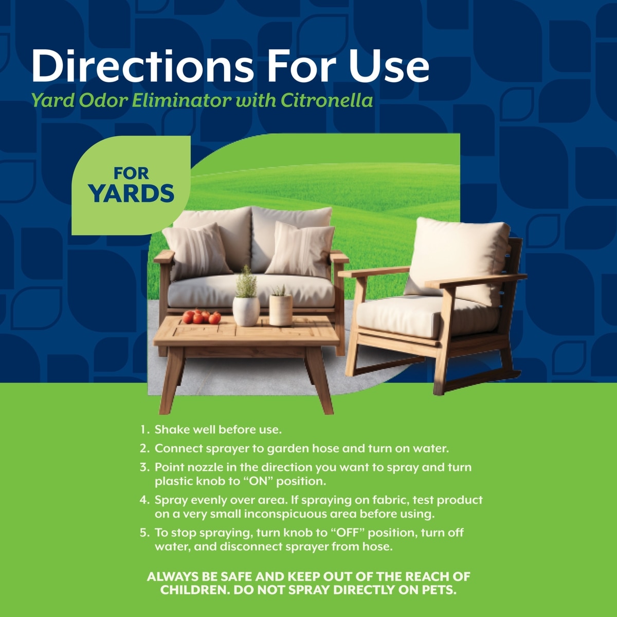This spray can be used on plants, patio furniture, kennels, swing sets, fences and other outdoor surfaces. If using on fabric, it is recommended to spot test first.