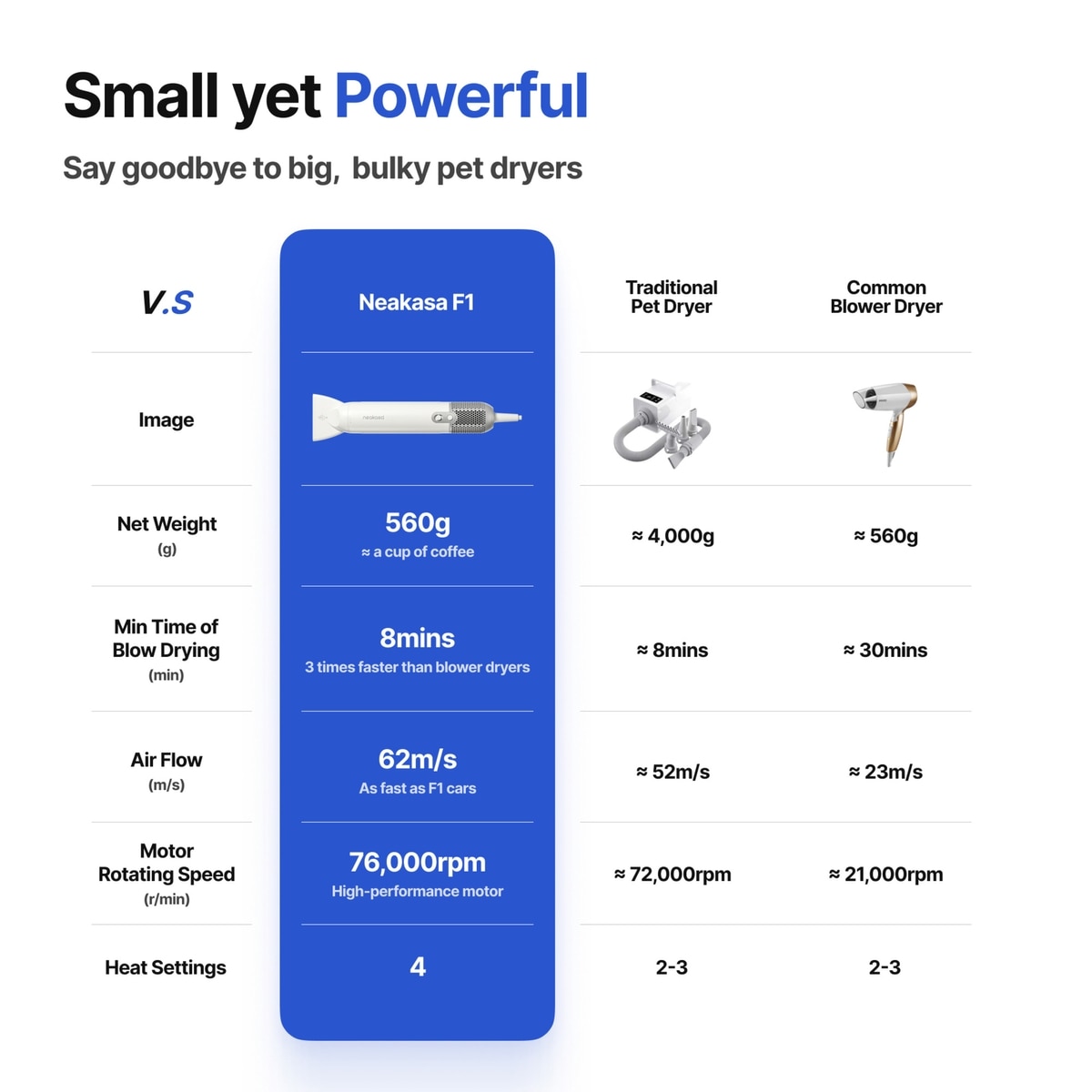 - Dries up to 65% faster than traditional pet dryers with its 62m/s high-speed drying.