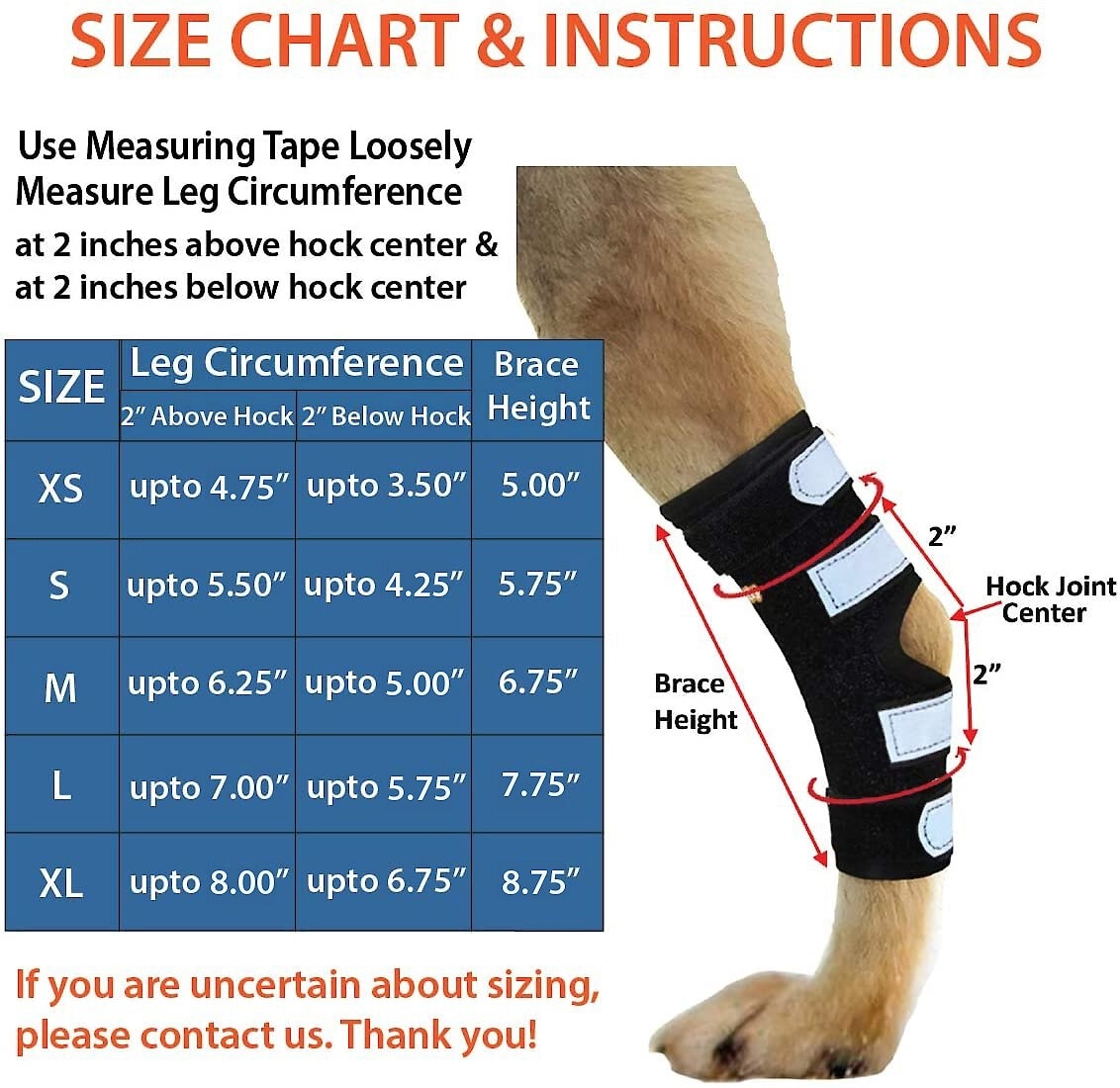 To determine the best fit for your dog, it is recommended to measure the circumference of your dog's leg 2-inches above the hock joint, and 2-inches below the hock joint. For the complete sizing chart, click the “Size” tab, next to the “Instructions” tab, just under the product photos. You can also refer to the complete sizing chart below: