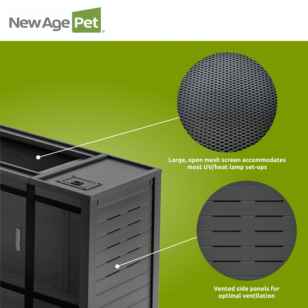 New Age Pet ECOFLEX Mojave Reptile Enclosure, Black, 150-gal—The mesh screen top can accommodate most UV and heat lamp set-ups.