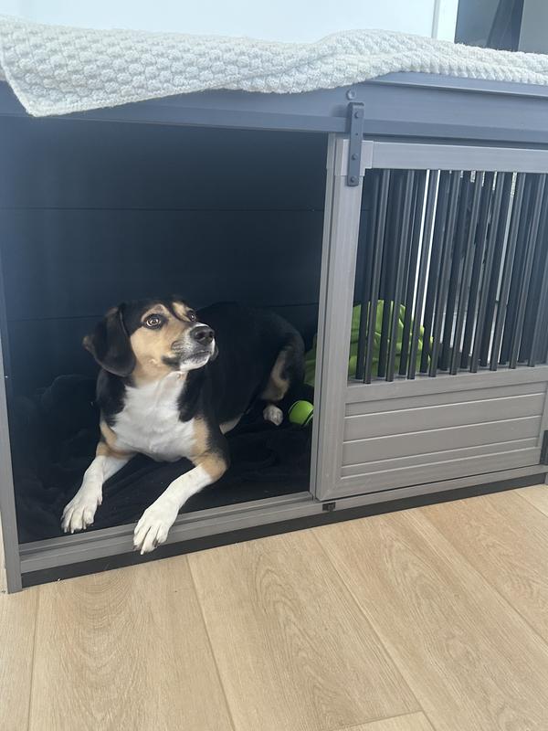 - This crate provides a safe and secure hangout space for your furbaby, doubling as an end table for added functionality.