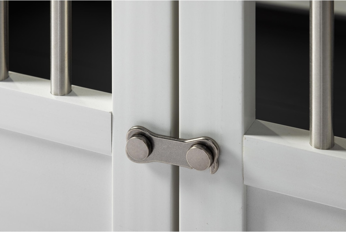 - Features stainless steel spindles and bone-shaped latches for added style and security.