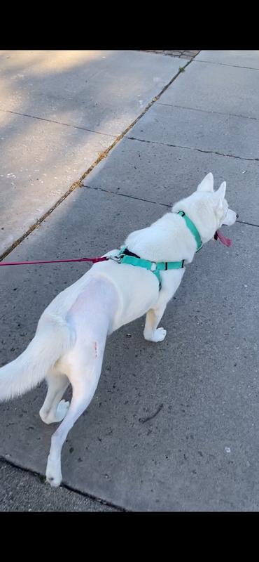 My husky who, like any young husky, will pull (regardless of recovering from surgery or not.. eeek) but I can see and feel how secure and comfortable this harness is for her! Gives me so much peace of mind and the vibrant color options make it fun/ easier for drivers to see! Highly recommend!