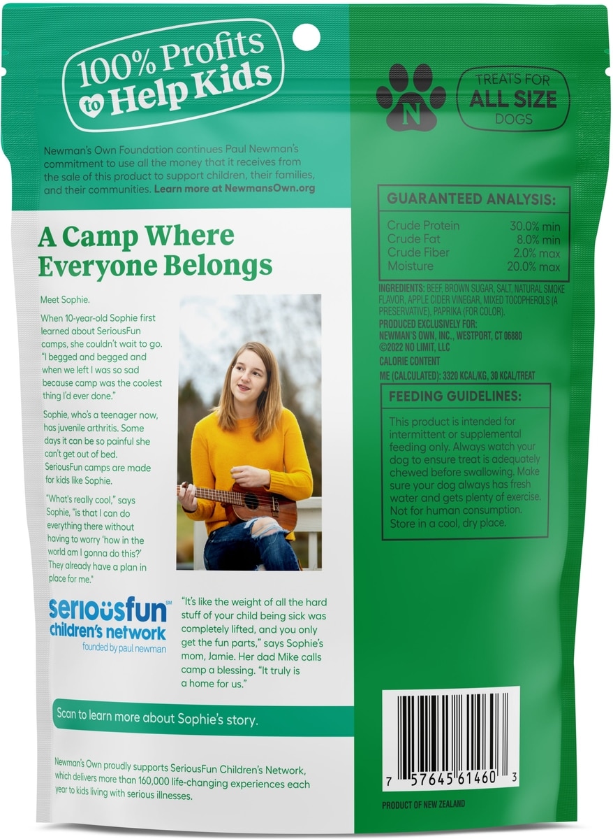- Newman's Own Beef Jerky Beef & Sweet Potato Recipe Dog Treats, 5-oz bag$9.00 Chewy Price$9.09 List Price$8.55 Autoship PricePromo, New Customers Only: Spend $49+, Get $20 eGift Card +1 deal
