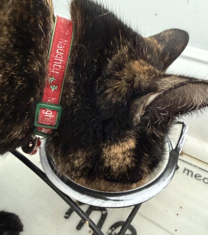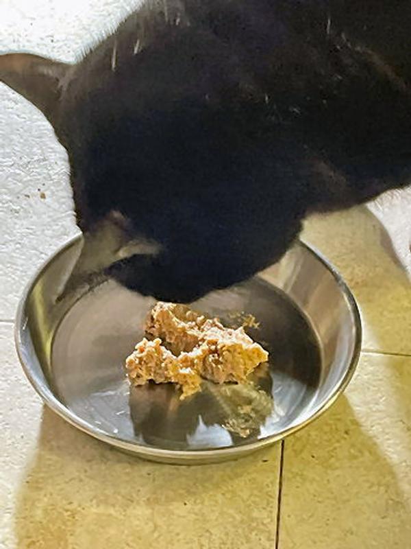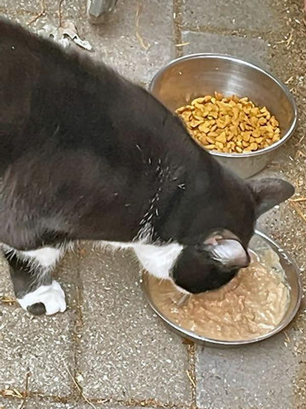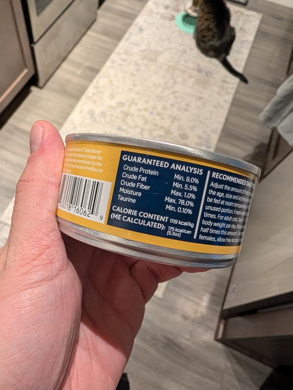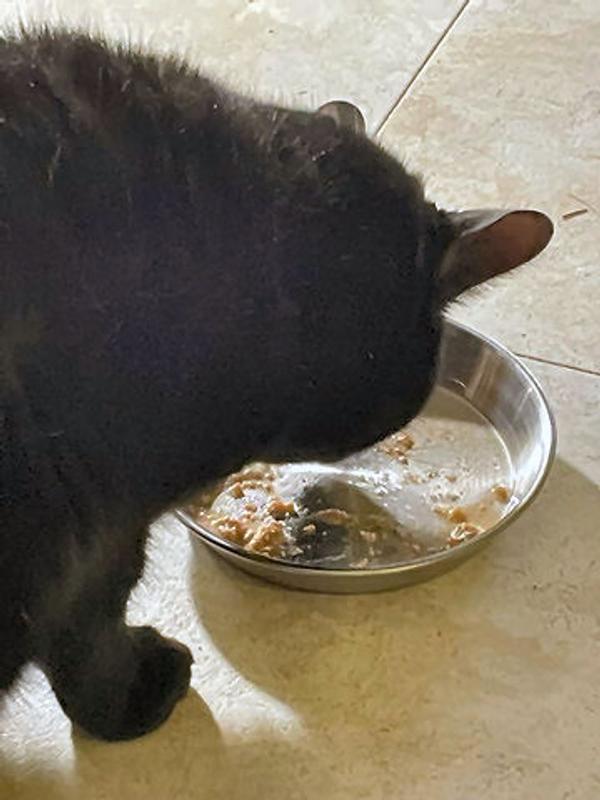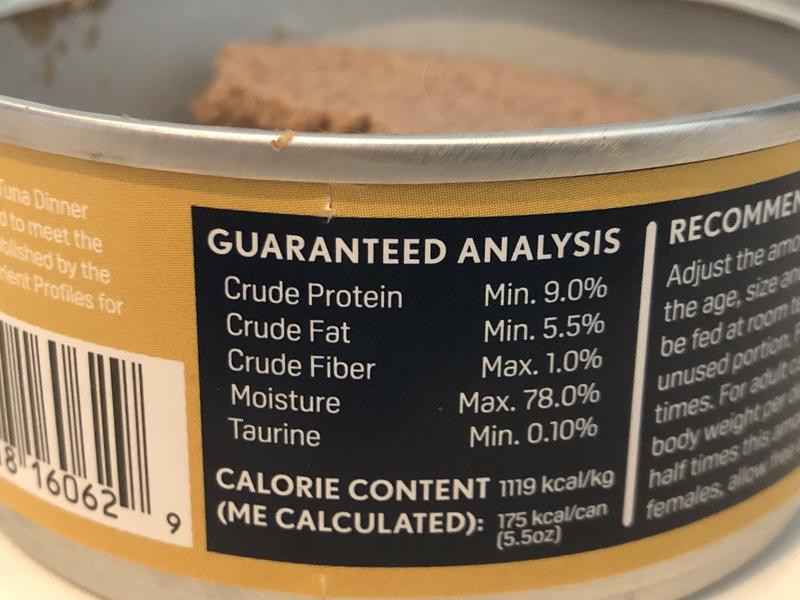 Having multiple cats, I was really pleased to find something in a larger can that went over as well as this did. I did get some mixed results, but that is very typical of my bunch and in no way reflects badly on the food. With my cats, results may differ from day to day, or even at different times on the same day. What can I say? They’re cats! As it is in the can, it’s pretty firm, but stirring water into it easily turned it into a smooth, soft consistency. I do this with every canned food I give my cats anyway, as it can be a challenge to make sure cats are getting enough water. When I first put this down, I didn’t add any water, just to see if they would like it that way. Two of my inside friends started wolfing it down like they were starving (spoilers, they’re not). My fussy boy who never eats anything I try to give him ate a little and walked away. My little female did the same. When I added water to their dishes, everyone took a greater interest in it. Even my super-fussy boy came back and had some more. If you look at the pictures of some of my cats eating, you’ll see how the food looks with and without water added. When I gave some to my outside friends, they were even more enthused than the inside gang was. I’ve never seen one of them eat as fast as he did when he got this food. He’d been fed earlier in the morning, but acted ravenous (another spoiler-he’s not either), when I put this in front of him. He ate more of this than I’ve seen him eat of any other canned food I’ve given him. I’m especially grateful to have this available for them now, as we are having some unseasonably brutal cold and wind chills. (No worries, they have warm, safe places to shelter in). This food seems to keep the cats full longer and it has some great nutrition. I’ve posted a photo of the results for wet and dry carb content, per the formula, and was pleased to see that even my diabetic cat (who has been getting his meds lowered and may be off the insulin very soon, per my vet) could have some. One thing I found was that there were five damaged cans in the case. These are shipped in a single layer of 12, wrapped securely in plastic. The outer packaging was not damaged. Every one of the cans was damaged in the exact same way, except one had the same damage in two places. This most definitely happened during manufacturing. The damaged spots were not facing the outer edge of the cardboard tray and the labels were not damaged even though the cans were dented beneath them. None were damaged to the point that I would worry about giving them to the cats, but it is something I’d like to see the manufacturer take a look at and hopefully correct for the future. I would definitely recommend this food, with no reservations. If your cats are up and down fussy the way mine can be, give them a few chances at different times of day, with or without the water added. I bet that even the few who may turn it down will like it once they are persuaded to try some.