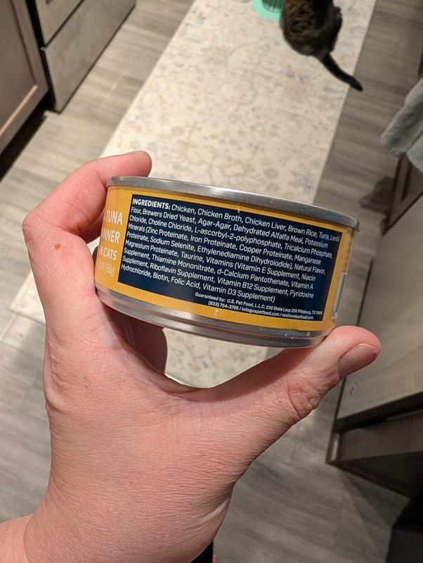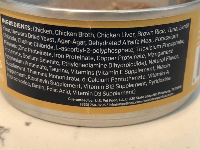 Chicken, Chicken Broth, Chicken Liver, Brown Rice, Tuna, Lentil Flour, Brewers Dried Yeast, Agar-Agar, Dehydrated Alfalfa Meal, Potassium Chloride, Choline Chloride, L-Ascorbyl-2-Polyphosphate, Tricalcium Phosphate, Minerals (Zinc Proteinate, Iron Proteinate, Copper Proteinate, Manganese Proteinate, Sodium Selenite, Ethylenediamine Dihydroiodide), Natural Flavor, Magnesium Proteinate, Taurine, Vitamins (Vitamin E Supplement, Niacin Supplement, Thiamine Mononitrate, D-Calcium Pantothenate, Vitamin A Supplement, Riboflavin Supplement, Vitamin B12 Supplement, Pyridoxine Hydrochloride, Biotin, Folic Acid, Vitamin D3 Supplement).