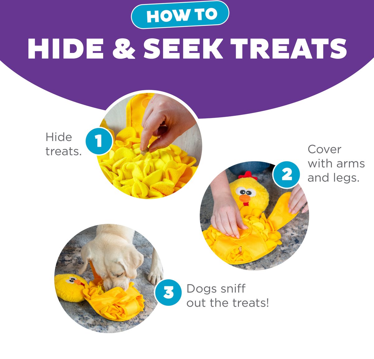 My older dog was recently diagnosed with cognitive dysfunction. I got this to help engage his mind. I have a plastic interactive toy but he doesn’t like to play with it because it is hard and makes noise when the puzzle pieces move. This one is perfect for him because it is soft and there’s nothing that would scare him. He seems to really enjoy sniffing out the treats from the chicken’s belly. It seems to be well made too.