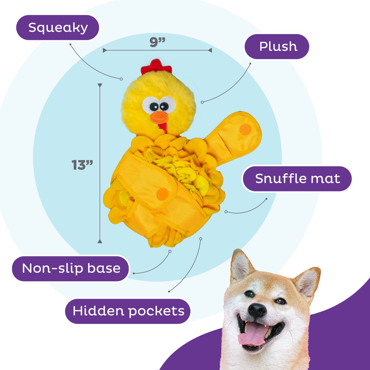 • This toy combines a snuffle mat and a plush dog toy for the ultimate interactive puzzle experience.