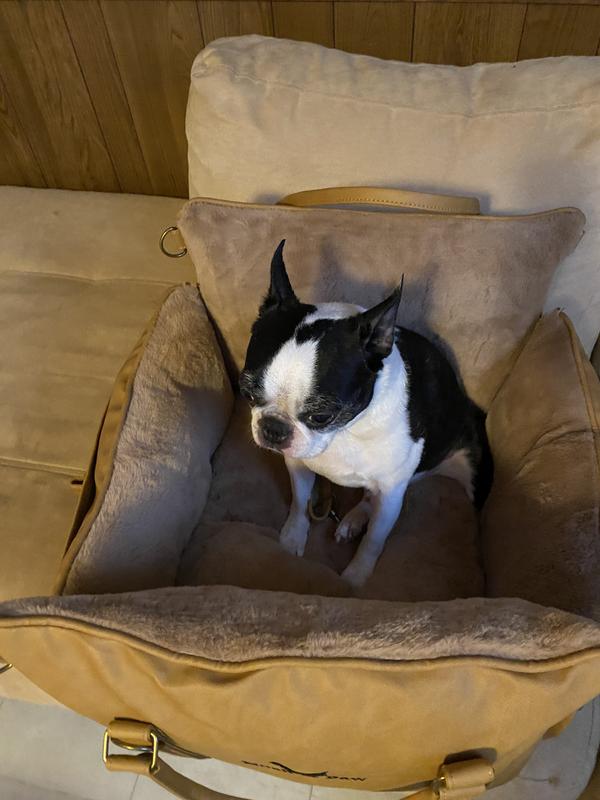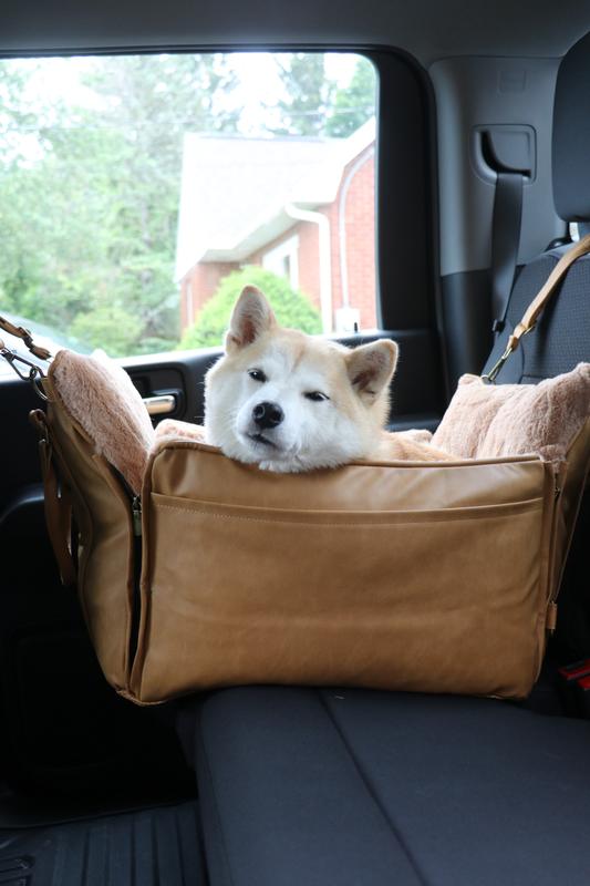 This car seat is amazing. It not only looks expensive but it feels expensive as well. The vegan leather is of the highest quality the interior is so soft even my cat crawls in it whenever we bring it in the house. It’s so sturdy, it has two straps for around the car seat and an interior buckle to attach the dog harness to the seat. My boys love it and it makes traveling so much easier. I now need to buy two more. This is the first ever, the dogs didn’t cry or try to get to me because they wanted to sit on my lap while on a car ride. They are completely content in this car seat.