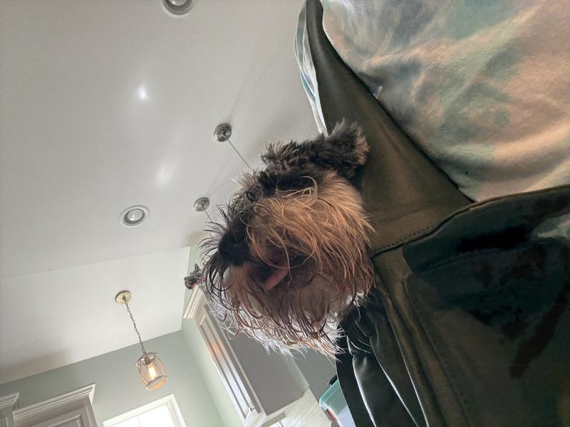 Training my Griffy pup to accept being carried in a bag to take her everywhere, she didn't like it @ first but after our Kroger shopping trip she does now.