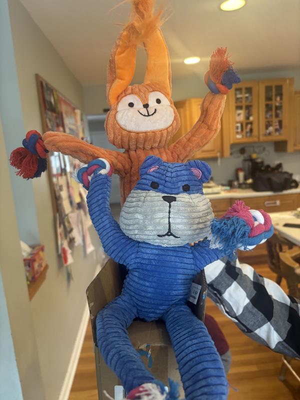 I was hesitant to buy these without reviews to look at first, but I'm glad I took this gamble! These feel quite sturdy, all the way down to the stitching connecting the various body parts! The inner rope survived the human pull test, and we pulled as hard as our XL puppies will be. I am quite pleased. My only concern is packaging...I got lucky as not to tear one of the two toys itself, as I used car keys instead of a knife/scissors to open...although I suspect the fabric may have survived the blade, I would not recommend it...there is not paper, plastic, or any other protective measure between the the toy and the box. All in all, very pleased with quality of product when compared against it's price!