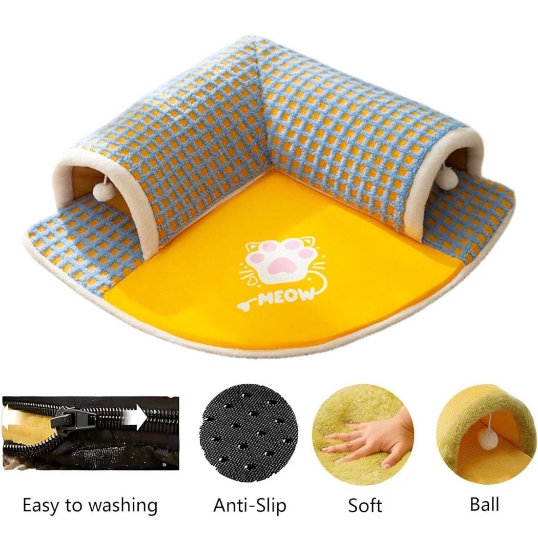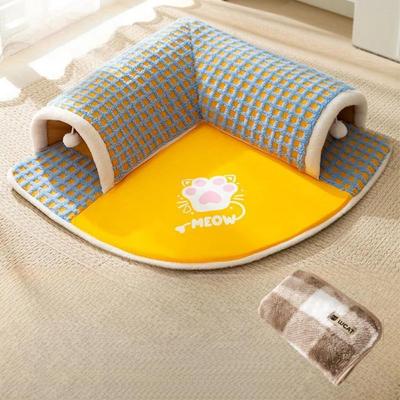 NonoPets 3-in-1 Durable Polyester Cooling Bed Cat, Rabbit & Hamster Tunnel & Play Mat with Blanket, Yellow/Blue, Large