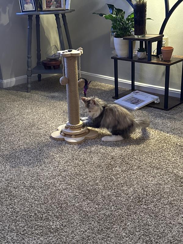 This thing is horrific. I can’t help but LOL at how bad it is. The instructions to put it together were practically worthless. Just. don’t buy this. LOL. Our one kitten really likes the feather though.