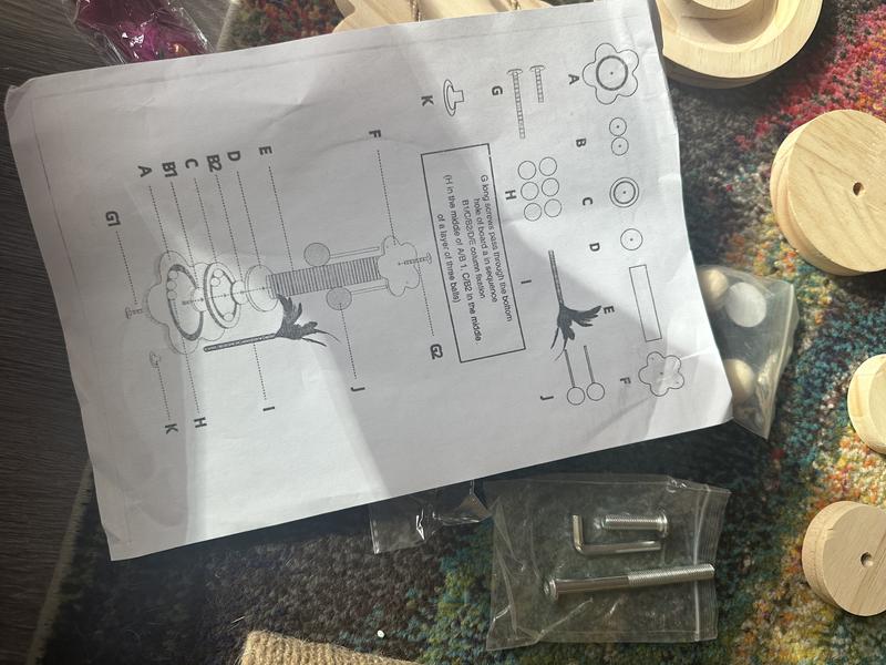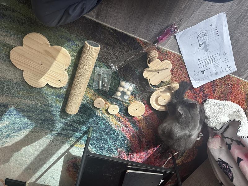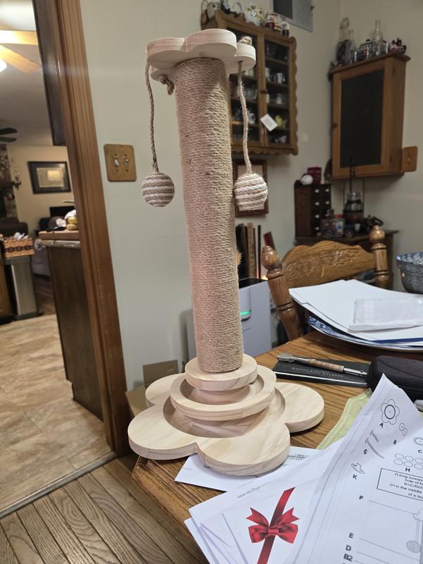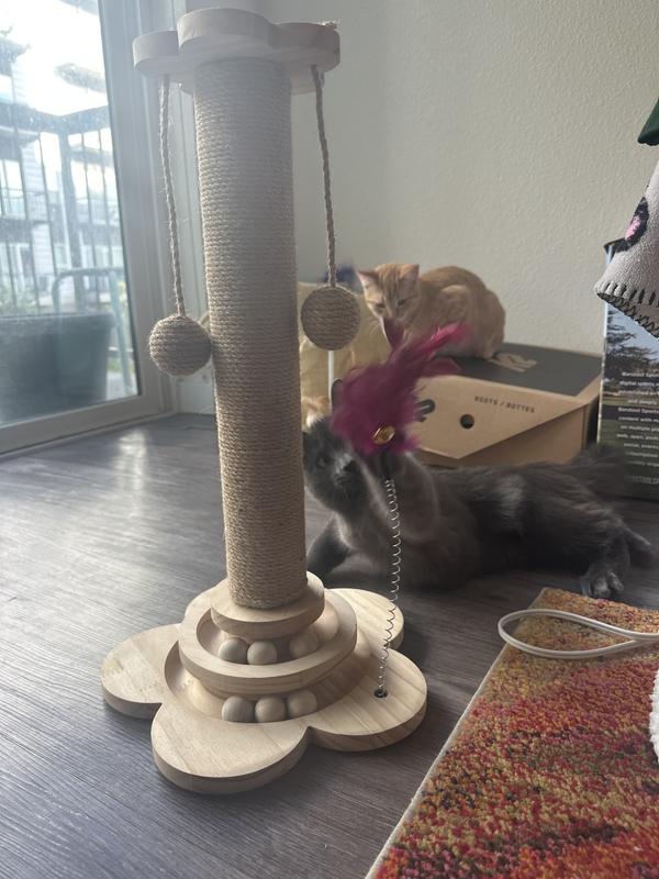 Very cute, easy to assemble and the cats like the balls and feather. Only thing is it’s much smaller than I was expecting and light weight so unless I stick it to the floor or some platform, it immediately topples over when my adult cats try to scratch it - kind of defeats the purpose. I can see this being good for a kitten.