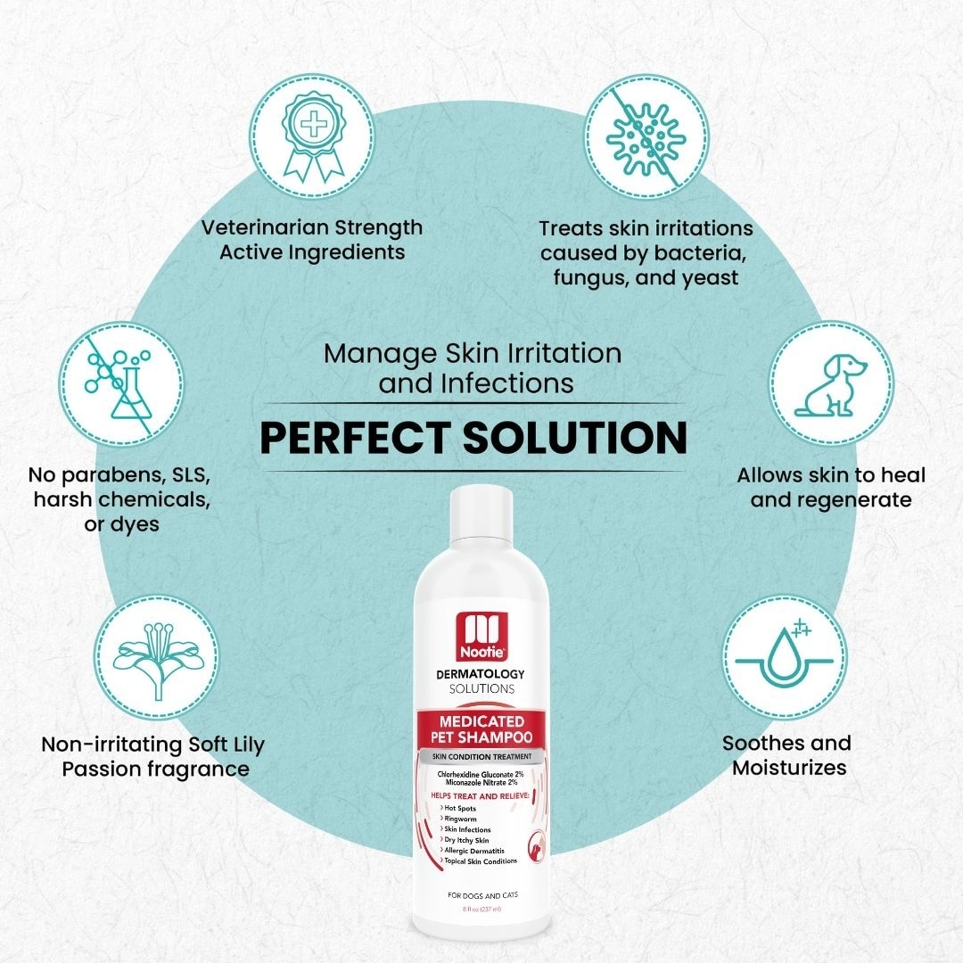 Nootie Medicated Antimicrobial Shampoo is formulated to help relieve and heal symptoms due to skin infections caused by bacteria, fungi, and yeast. It is ideal for pets with ringworm and dermatitis, and also helps prevent hot spots if used early on flea bite dermatitis. This shampoo does not remove warts.