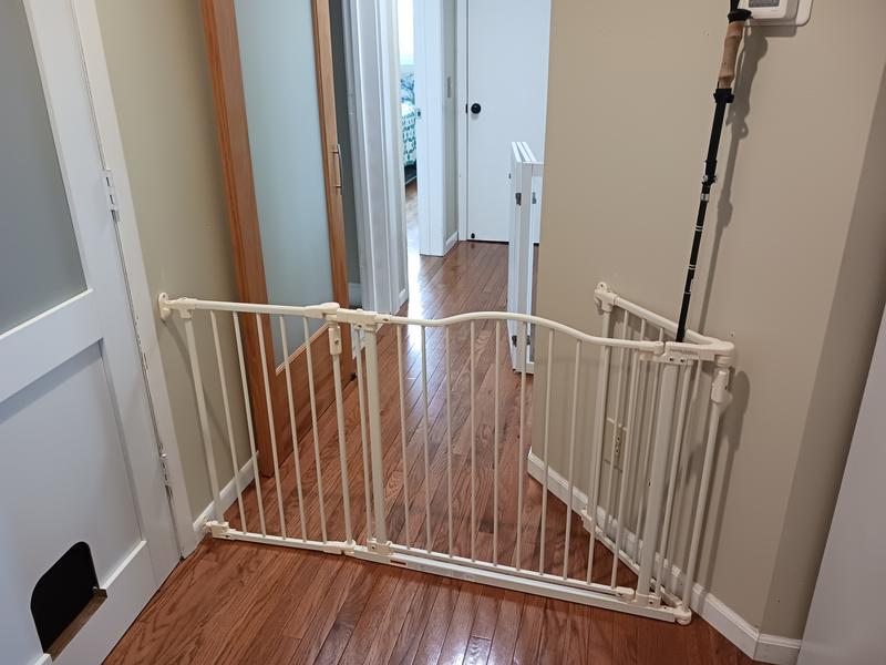 This gate can be positioned to fit openings 38.3 inches to 72 inches wide. The gate will be more curved or straight depending on how wide of a space it occupies.