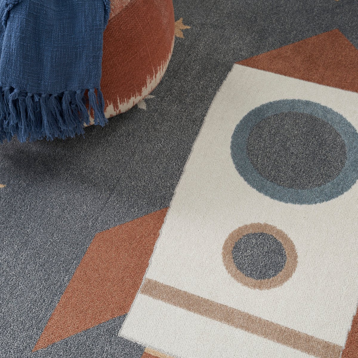 - This rug features a soft, multicolored rocket soaring through space on a blue background, perfect for inspiring dreams and imaginative play.
