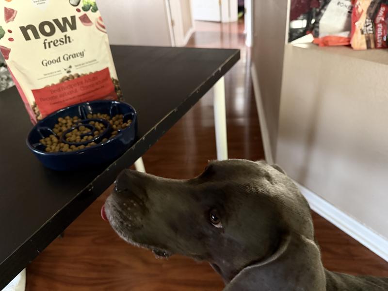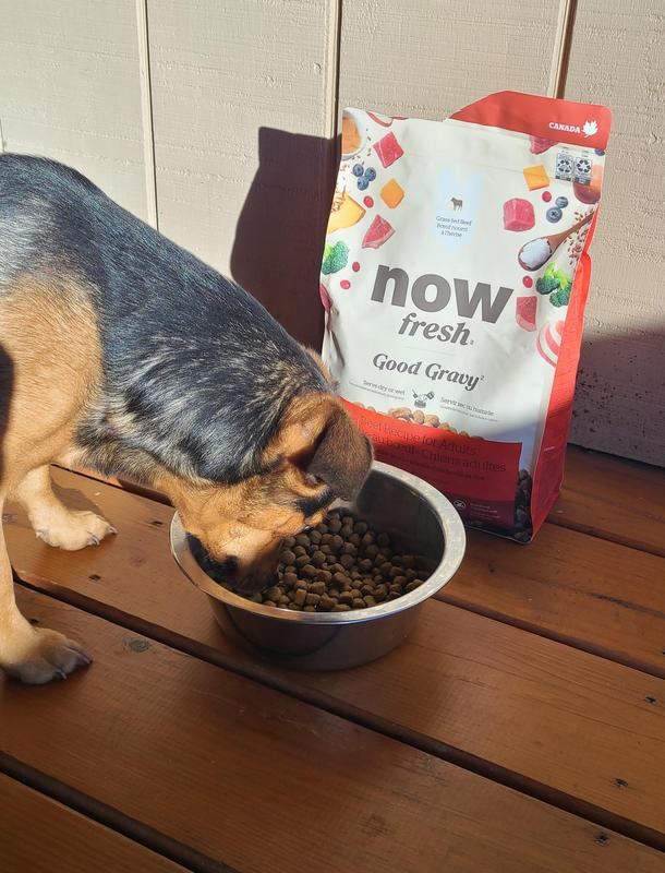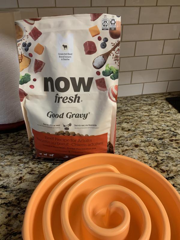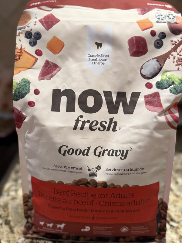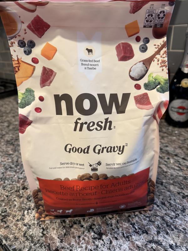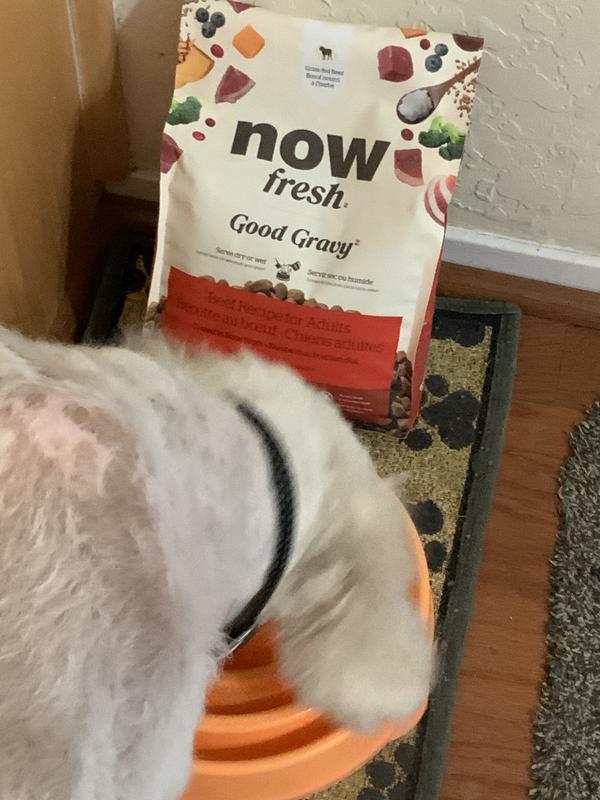 We are impressed with Now Fresh Good Gravy Adult Chicken-Free Beef Recipe with Ancient Grains. My dogs prefer bite size kibble and this is perfect. We make the bone broth gravy version and they absolutely love it! My senior rescue can be funny with kibble but she throughly enjoys this food. I really like the wholesome, nutritious ingredients including the grass-fed beef, bone broth and lots of veggies. This food definitely checks all the boxes!