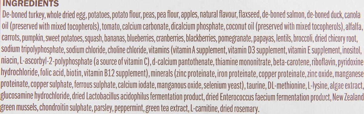 Fresh meat and fish: Made with de-boned turkey, salmon, and duck.
