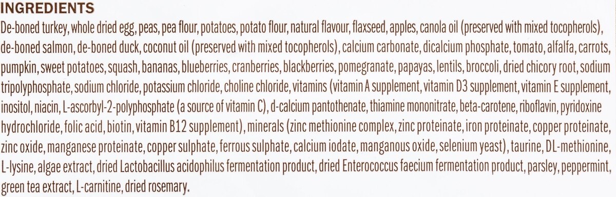 Fresh meat and fish: Made with de-boned turkey, salmon, and duck.