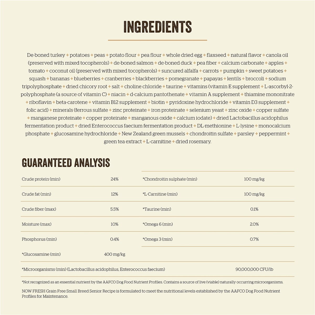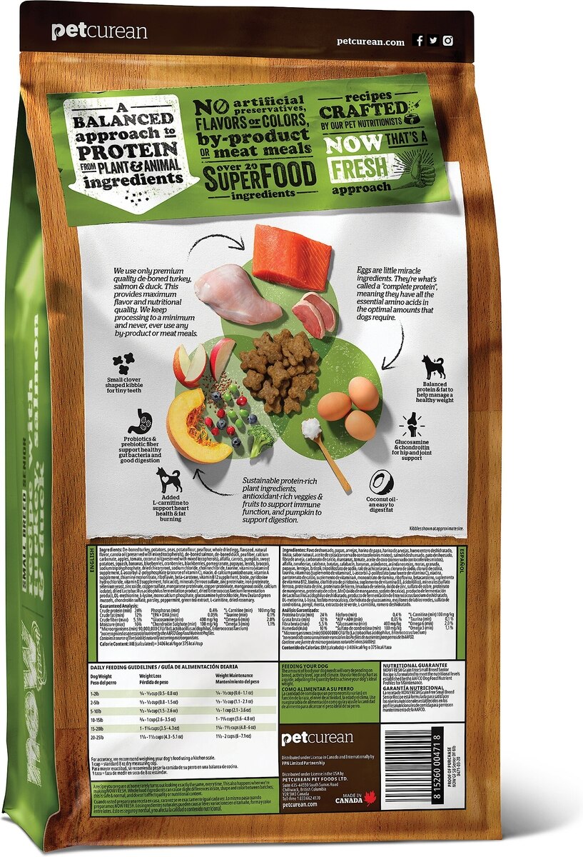 Created by Nutrition Experts Now Fresh small breed dry food features premium-quality small kibble designed for tiny teeth. It supports healthy digestion with probiotics and prebiotics and freshens breath with the natural power of parsley and peppermint.