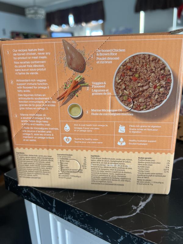 De-Boned Chicken, Chicken Broth, Carrots, Peas, Brown Rice, Tapioca, Calcium Sulphate, Sodium Tripolyphosphate, Flaxseed, Salt, Marine Microalgae Oil, Potassium Chloride, Minerals (Zinc Proteinate, Ferrous Fumarate, Sodium Selenite, Copper Proteinate, Manganese Proteinate, Potassium Iodide), Choline Chloride, Vitamins (Vitamin E Supplement, Thiamine Mononitrate, Niacin, Vitamin A Supplement, D-Calcium Pantothenate, Pyridoxine Hydrochloride, Riboflavin Supplement, Vitamin B12 Supplement, Vitamin D3 Supplement, Folic Acid), Magnesium Sulphate, Taurine.