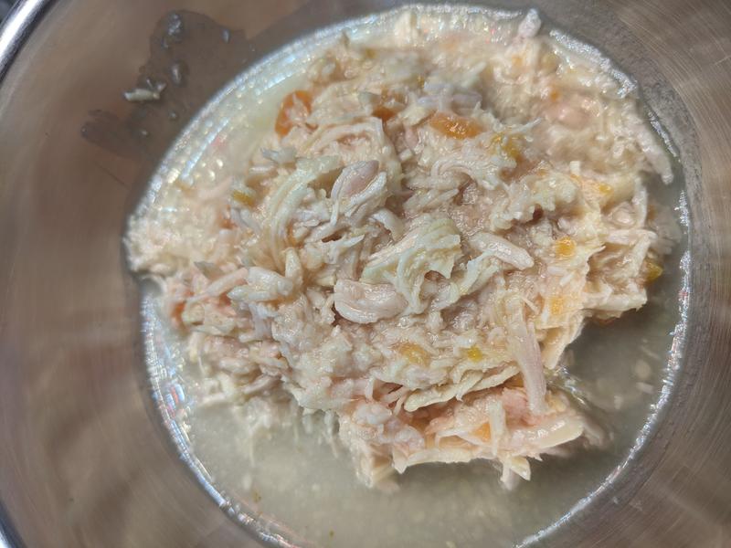 • The 4-ingredient recipe contains all-natural shredded chicken, wild-caught salmon, carrots, and chicken broth.