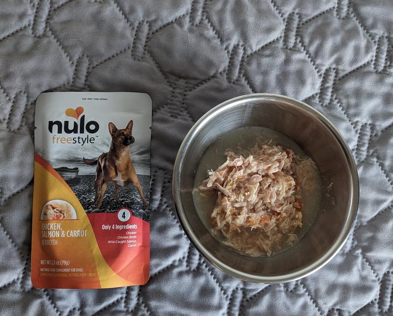 Nulo Freestyle Chicken Salmon Carrott dog food comes in convenient, easy open pouches. The ratio of gravy to ingredients is perfect and it has a pleasant smell. Upon opening a pouch and putting half of the contents on a saucer for my very picky eater, 51 lb male Chow Chow, Truman to try, I was amazed at how quickly he lapped it up and wanted more! I used this food as a meal as well as small daily snacks. He blew right through the box of pouches. I was very impressed with the ease of dispensing it and thrilled that Truman loved it so much. We are eager to have more and make this an addition to his dry food.