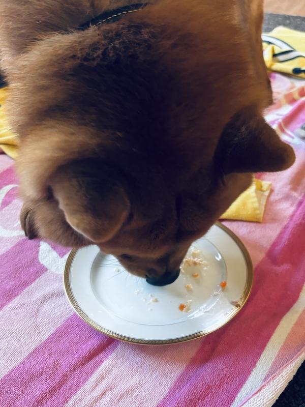 My 15 year old fussy husky has decided this stuff is the best thing ever! As soon as I started to squeeze this topper onto her dry food, Emmy couldn’t wait to eat. With easy to open, convenient packaging I find this far superior to canned wet food when I need to encourage her to eat, no dirty spoon or leftovers in the fridge. Also it’s nice that this actually smells like food, (real fish and chicken!), rather than typical wet dog food.