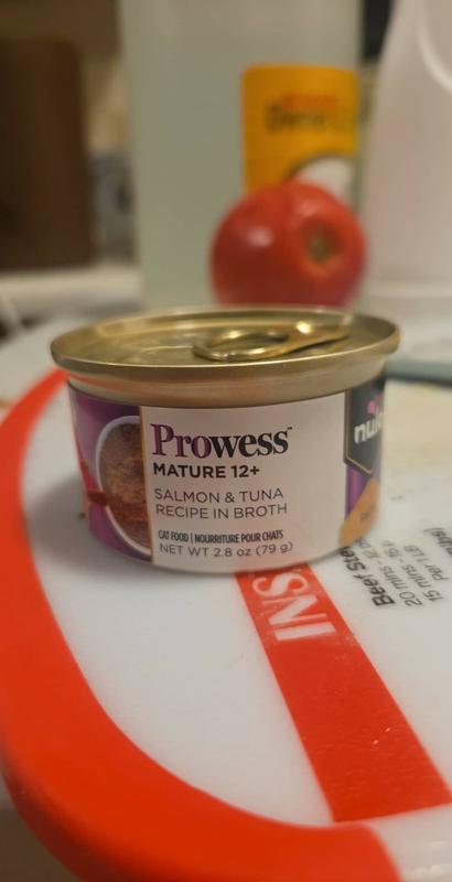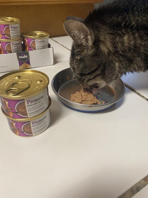 We have a couple of senior cats. One of them can now only eat pate and is very, very picky about what she eats; at one point we thought we might lose her because she decided she didn't want to eat any more. We tried Nulo Prowess Mature 12+ Salmon and Tuna. They make another flavor but we knew that wouldn't work. She ate this. Because she ate this, she gained a little weight and got back some strength and is now happy to eat other foods as well. As usual, I will post the positives and negatives for this product. Positives: 1. It comes in a 12-pack with a clear plastic wrapping that we can recycle at our grocery store. 2. Each can includes "Feeding Guidelines," which you don't find on other cat foods. 3. Each can includes a complete list of ingredients and they are wonderful. 4. Our old cat LOVES it. It got her eating again and we can breathe easier. It is in a yummy tast7 broth that keeps her interest. Negatives: 1. It's a little pricey.