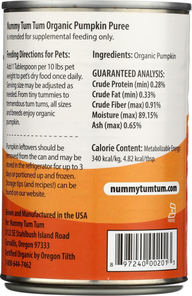 Nummy Tum-Tum Pure Organic Pumpkin Canned Dog & Cat Food Supplement, 15-oz, case of 12