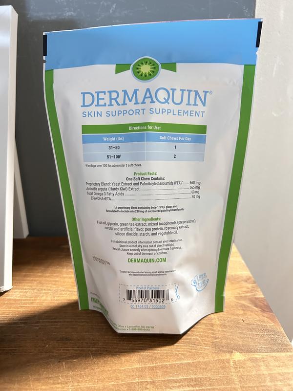 My dogs are absolutely obsessed with Nutramax Dermaquin skin support chews. They think they’re getting a treat, which makes it so easy to give them. One of my dogs