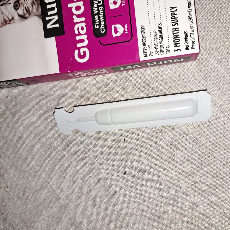 I'm pleased with Nutri Vet Guard Plus flea and tick med for cats. It's an easy squeeze tube that has no odor. I had to put the tube to my nose to get a scent and it was a soft fresh scent. My favorite thing was the ointment stayed on the spot. Some flea and tick med runs on their hair but not this one. It's not greasy and surprisingly dried quickly. There was no drama when applying to all 3 of my cats. I usually get drama when I apply flea and tick med I get from my vet. My cats have been on this only 2 weeks but so far I'm very satisfied with the results. I definitely recommend trying this product.